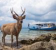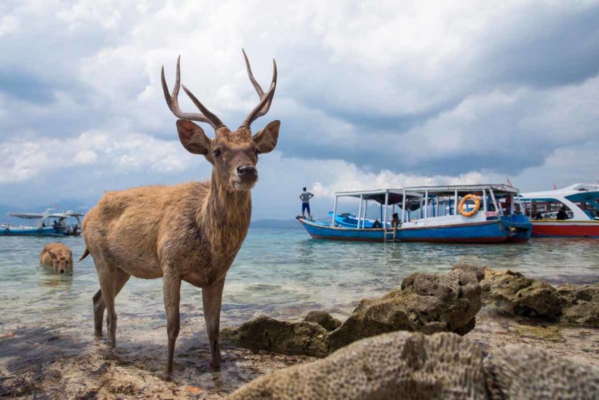 Die einzigen Bewohner von Menjangan Island sind Rehe. Ja, du hast richtig gehört: Rehe! Die eleganten Tiere halten sich meist im Inselinneren auf. Doch zum Ende der Trockenzeit kommen sie hin und wieder an den Strand, um im Wasser zu baden und natürlich um das ein oder andere Lunchpaket und etwas Wasser bei den Tauchern abzuluchsen.